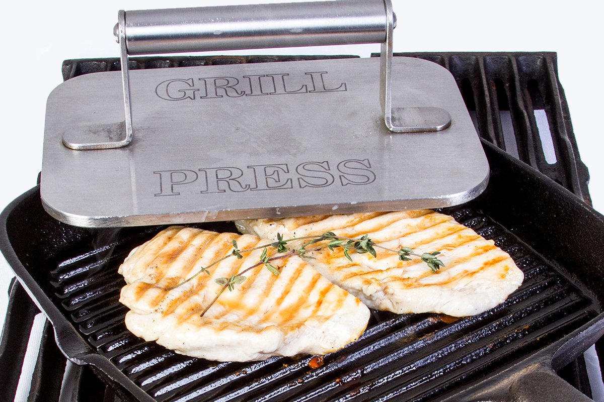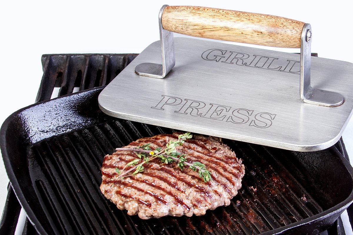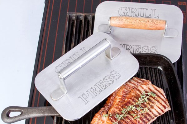 Grilling is great unless the food being cooked is small or delicate. Fish and seafood, as well as vegetables, can be a challenge. Using our grill press will alleviate these problems. Whether a high direct heat or a low indirect heat, placing our grill press on the grill provides the space to safely hold these more troublesome foods. This is also a perfect solution for grill items that might need a sauce. Imagine prawns for instance. Prawns can fall through the cooking grate unless placed on skewers, but in a cast-iron skillet the whole dish can be prepared in minutes with no worries, and a pair of steaks can be grilling next to it for a perfect surf and turf meal.